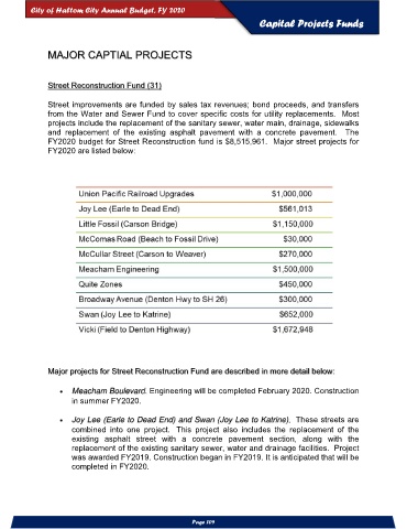 Major projects for Street Reconstruction Fund are described in more detail below: