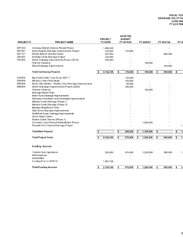 Calloway Branch Channel Repair Project Snow Heights Drainage Improvements Project Walker Branch Channel Repair Emerald Circle Drainage Project Street Drainage Improvements Project (2019) Channel Cleaning Street Drainage Improvements Total Continuing Projects Big Fossil Creek Flood Study- BCF 7 Mackey Creek Flood Study Street Drainange Improvements Project (2020) Channel Cleaning Drainage Master Plan Eden Road Drainage Improvements Mackey Creek Drainage (Phase I) Mackey Creek Drainage (Phase II) Meadow Road/North Forty Odel Street Drainage Improvements Smithfiled Acres Drainage Improve