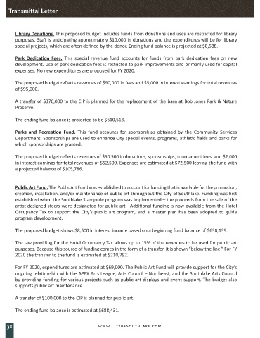 creation, installation, and/or maintenance of public art throughout the City of Southlake. Funding was first