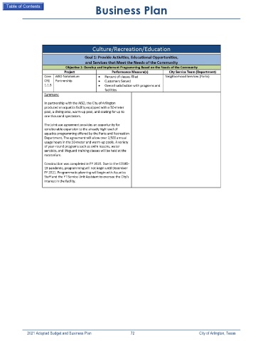 Business Plan of Contents Contents Table Table of Contents of Table 2021 Adopted Budget and Business Plan 72 City of Arlington, Texas