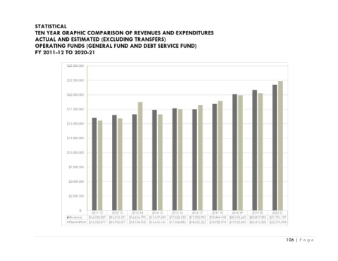 STATISTICAL TEN YEAR GRAPHIC COMPARISON OF REVENUES AND EXPENDITURES ACTUAL AND ESTIMATED (EXCLUDING TRANSFERS) OPERATING FUNDS (GENERAL FUND AND DEBT SERVICE FUND) FY 2011-12 TO 2020-21 106 | P a g e