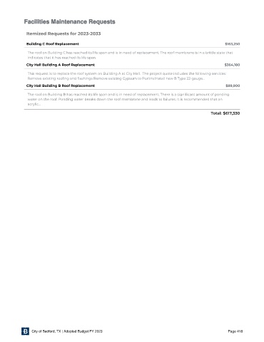 The roof on Building B has reached its life span and is in need of replacement. There is a signi cant amount of ponding