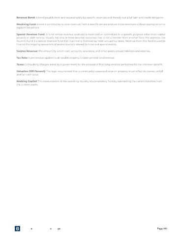 Revenue Bond: A bond payable from and secured solely by speci c revenues and thereby not a full faith and credit obligation.