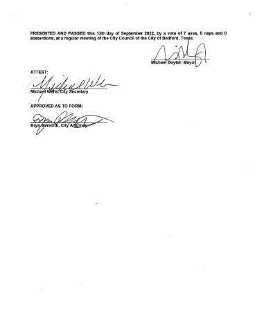 PRESENTED AND PASSED this 13th day of September 2022, by a vote of 7 ayes, 0 nays and 0 abstentions, at a regular meeting of the City Council of the City of Bedford, Tex; s. chael Boyte , Mayo ATTEST: 11 - Michael / ecretary APPROVED AS TO FORM: