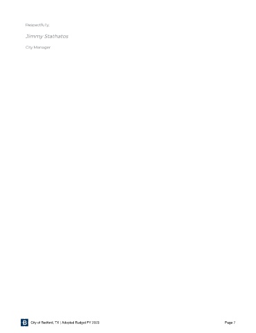 Respectfully, Jimmy Stathatos City Manager City of Bedford, TX | Adopted Budget FY 2023 Page 7