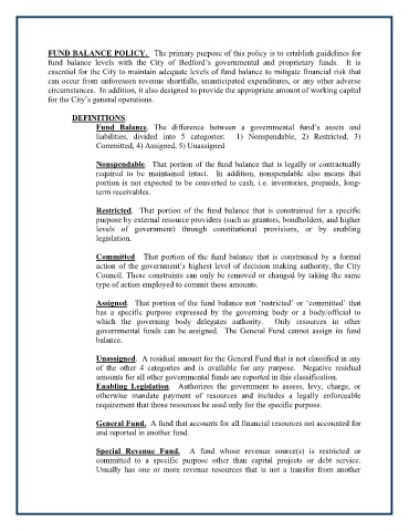 fund balance levels with the City of Bedford’s governmental and proprietary funds. It is