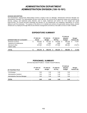 The Administration Department's Administration Division consists of the City Manager, Administrative Services Manager and