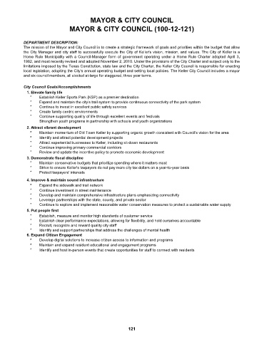 local legislation, adopting the City’s annual operating budget and setting local policies. The Keller City Council includes a mayor