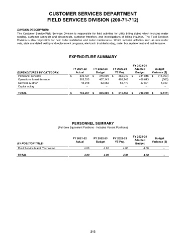 The Customer Service/Field Services Division is responsible for field activities for utility billing duties which includes meter