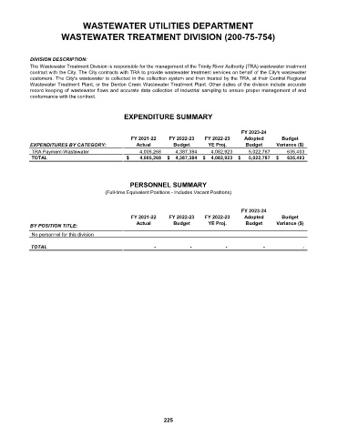 The Wastewater Treatment Division is responsible for the management of the Trinity River Authority (TRA) wastewater treatment