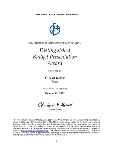 award of Distinguished Presentation to the City of Keller for its annual budget for the fiscal year beginning