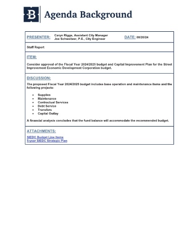 Consider approval of the Fiscal Year 2024/2025 budget and Capital Improvement Plan for the Street