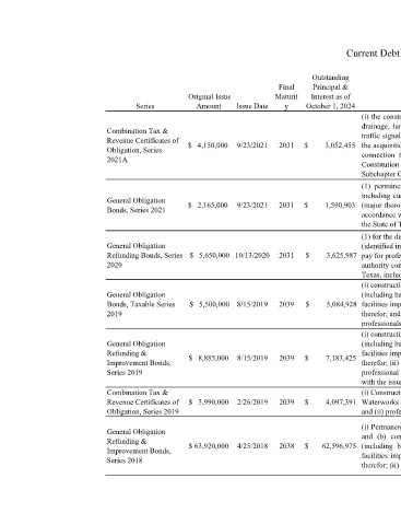 Current Debt Issuances Self- Supporting? Purpose of Debt including streets, improving and constructing wit: to works, public of construction the (i) signage, sidewalks, gutters, curbs, walls, retaining streetscaping, landscaping, drainage, and thereto incidental relocation system utility abatement, noise street signalization, traffic Yes in rendered services professional (ii) and therefor rights-of-way and land of acquisition the the with conformity in and by conferred authority to pursuant therewith, connection Code, Government Local Texas including