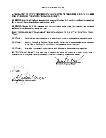 SECTION 2. The City Council of Bedford, Texas hereby ratifies the property tax increase reflected