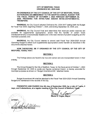 nays, and 0 abstentions, at a regular meeting of the City Council of Bedford, Te • s.