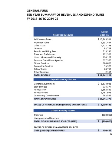 TEN YEAR SUMMARY OF REVENUES AND EXPENDITURES