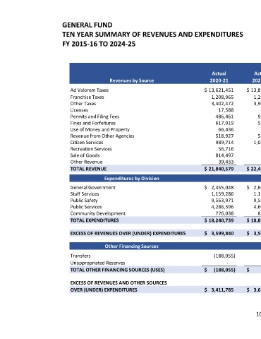 TEN YEAR SUMMARY OF REVENUES AND EXPENDITURES