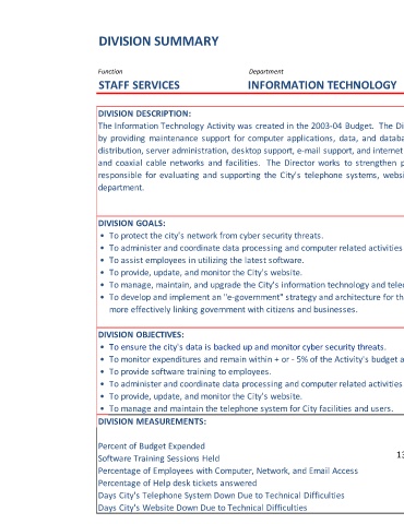 The Information Technology Activity was created in the 2003-04 Budget. The Director of Information Technology assists in the daily operations of City divisions