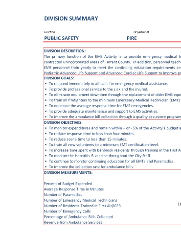 The primary function of the EMS Activity is to provide emergency medical treatment and transportation of the sick and injured within Benbrook and the
