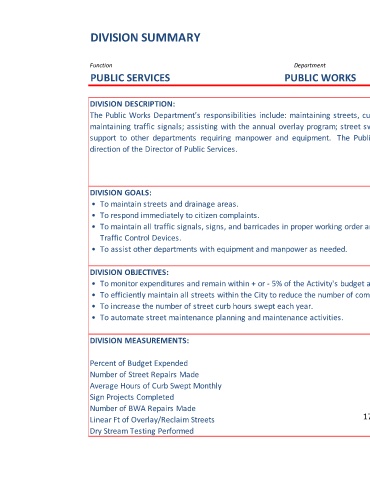 maintaining traffic signals; assisting with the annual overlay program; street sweeping; and mowing rights-of-way. The Public Works Department also provides