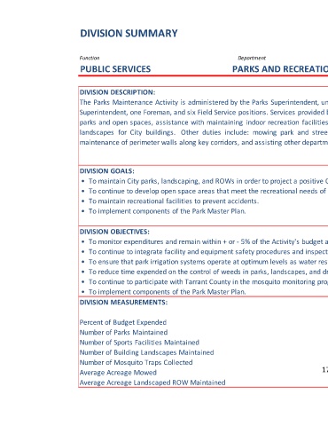 Superintendent, one Foreman, and six Field Service positions. Services provided by the Parks Maintenance Activity include: the maintenance and development of