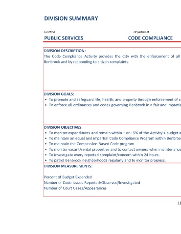 The Code Compliance Activity provides the City with the enforcement of all code violations. The Code Compliance Officers target violators by patrolling