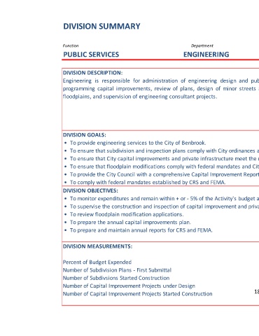 Engineering is responsible for administration of engineering design and public works projects, review of subdivision public improvements, planning and