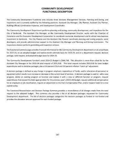 The Community Development Functional area includes three divisions: Management Services, Planning and Zoning, and