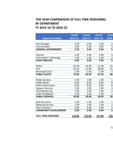 TEN YEAR COMPARISON OF FULL TIME PERSONNEL