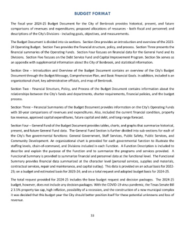 The fiscal year 2024-25 Budget Document for the City of Benbrook provides historical, present, and future