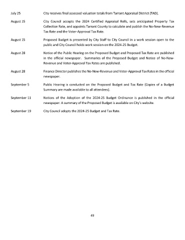 July 25 City receives final assessed valuation totals from Tarrant Appraisal District (TAD).