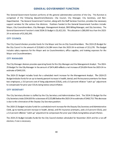 comprised of the following department/divisions: City Council, City Manager, City Secretary, and Non-