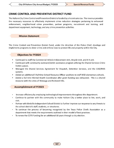 The Crime Control and Prevention District Fund, under the direction of the Police Chief, develops and