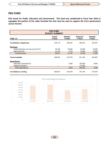 PEG stands for Public, Education and Government. This fund was established in Fiscal Year 2014 to