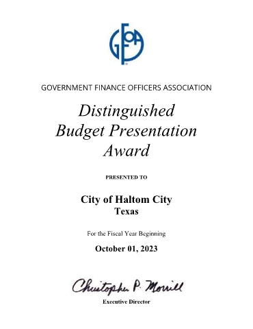 GOVERNMENT FINANCE OFFICERS ASSOCIATION Distinguished Budget Presentation Award PRESENTED TO City of Haltom City Texas For the Fiscal Year Beginning October 01, 2023 Executive Director