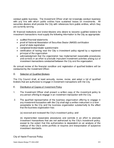 conduct public business. The Investment Officer shall not knowingly conduct business