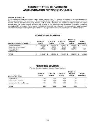 The Administration Department's Administration Division consists of the City Manager, Administrative Services Manager and