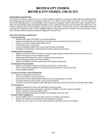 local legislation, adopting the City’s annual operating budget and setting local policies. The Keller City Council includes a mayor