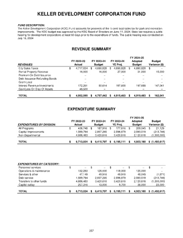 The Keller Development Corporation (KDC) Fund accounts for proceeds of the ½ cent local sales tax for park and recreation