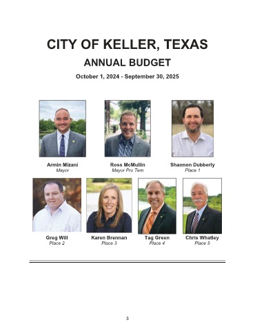 CITY OF KELLER, TEXAS ANNUAL BUDGET October 1, 2024 - September 30, 2025 Armin Mizani Ross McMullin Shannon Dubberly Mayor Mayor Pro Tem Place 1 Greg Will Karen Brennan Tag Green Chris Whatley Place 2 Place 3 Place 4 Place 5 3