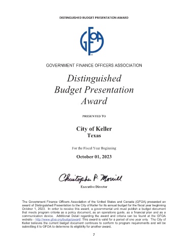 award of Distinguished Presentation to the City of Keller for its annual budget for the fiscal year beginning