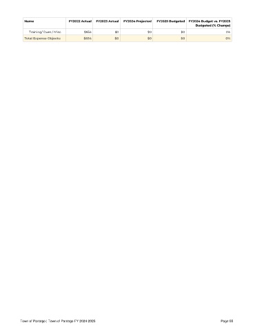 Name FY2022 Ac tual FY2023 Ac tual FY2024 Projec ted FY2025 Budgeted FY2024 Budget vs. FY2025 Budgeted (% Change) Training/ Dues / Misc. $654 $0 $0 $0 0% Total Expense Objec ts: $654 $0 $0 $0 0% Town of Pantego | Town of Pantego FY 2024-2025 Page 55