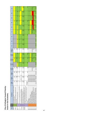 City of Arlington Council Priority: Invest In Our Economy Key Measures Citizen perception that Arlington is a great place to operate a business [annual survey] Citizen perception that Arlington is a great place to work [annual survey] ROW Permits Issued [cumulative totals] ROW Complaints Investigated/Resolved [cumulative totals] Total Acquisitions (Real Property and Easements) Turnaround time to 1st comments for commercial construction plans within 12 business days Tu