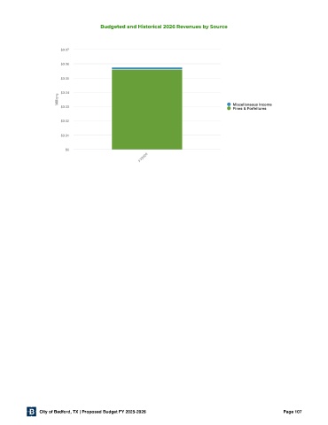 Budgeted and Historical 2026 Revenues by Source $0.07 $0.06 $0.05 $0.04 Millions Miscellaneous Income $0.03 Fines & Forfeitures $0.02 $0.01 $0 FY2026 City of Bedford, TX | Proposed Budget FY 2025-2026 Page 107