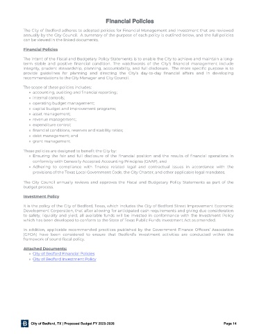 The City of Bedford adheres to adopted policies for Financial Management and Investment that are reviewed