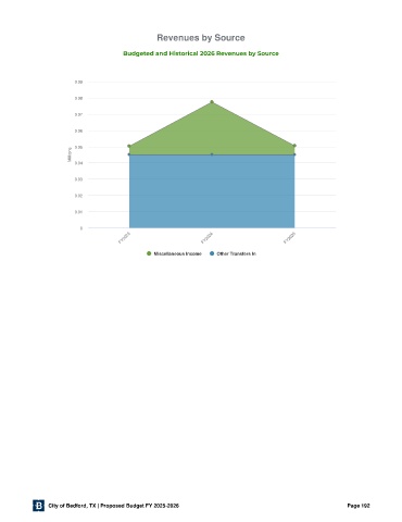 Revenues by Source Budgeted and Historical 2026 Revenues by Source 0.09 0.08 0.07 0.06 Millions 0.05 0.04 0.03 0.02 0.01 0 FY2023 FY2024 FY2025 Miscellaneous Income Other Transfers In City of Bedford, TX | Proposed Budget FY 2025-2026 Page 192