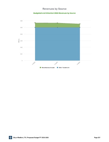 Revenues by Source Budgeted and Historical 2026 Revenues by Source 0.06 0.05 0.04 Millions 0.03 0.02 0.01 0 FY2023 FY2024 FY2025 Miscellaneous Income Other Transfers In City of Bedford, TX | Proposed Budget FY 2025-2026 Page 207