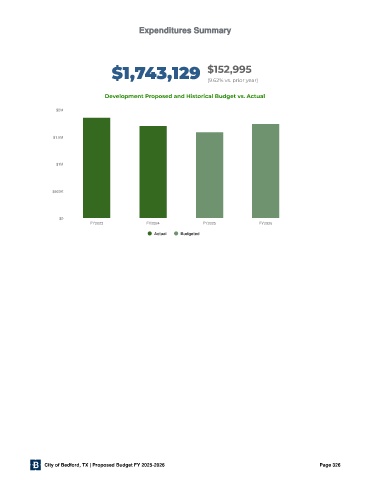Expenditures Summary B1,743,129 $152,995 (9.62% vs. prior year) Development Proposed and Historical Budget vs. Actual $2M $1.5M $1M $500K $0 FY2023 FY2024 FY2025 FY2026 Actual Budgeted City of Bedford, TX | Proposed Budget FY 2025-2026 Page 326
