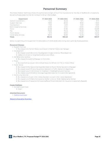 The linked Position Summary shows the authorized strength of Full-Time Equivalents for the City of Bedford for all positions,