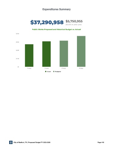 Expenditures Summary B $5,750,955 (18.23% vs. prior year) Public Works Proposed and Historical Budget vs. Actual $40M $30M $20M $10M $0 FY2023 FY2024 FY2025 FY2026 Actual Budgeted City of Bedford, TX | Proposed Budget FY 2025-2026 Page 418